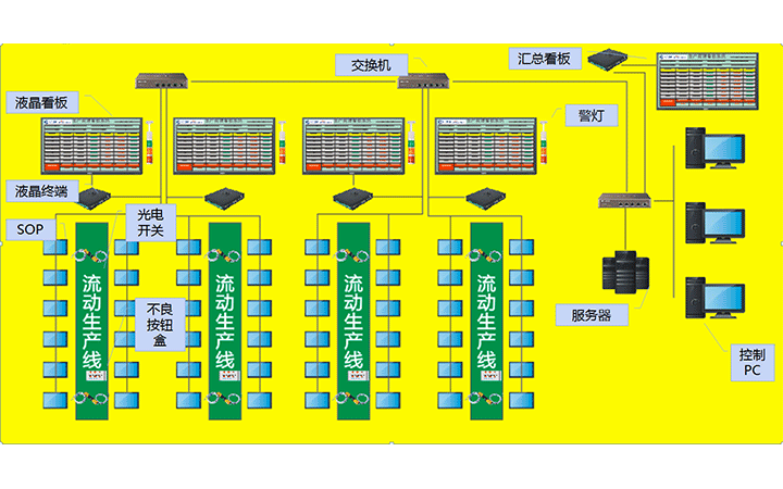 生產(chǎn)管理看板系統(tǒng)是指用于車間或生產(chǎn)線目視化管理(VM,Visual Management)的一種表現(xiàn)形式,即對數(shù)據(jù)、生產(chǎn)狀態(tài)等的情況一目了然地表現(xiàn),主要是對于生產(chǎn)進(jìn)度、生產(chǎn)狀態(tài)進(jìn)行的透明化管理設(shè)備。電子看板則通過利用形象直觀而又色彩適宜的各種視覺感知信息來組織現(xiàn)場生產(chǎn)活動,了解實(shí)時(shí)的生產(chǎn)進(jìn)度、產(chǎn)能、以及不良數(shù)等等。生產(chǎn)管理看板是發(fā)現(xiàn)問題、解決問題的非常有效且直觀的手段,是優(yōu)異的現(xiàn)場管理必不可少的工具之一;它是6s的基本工具。